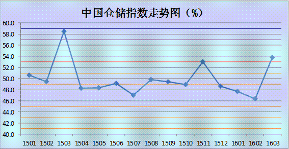 中國物流與采購聯合會與中儲發展股份有限公司聯合調查的2016年3月中國倉儲指數為53.8%,較上月大幅回升7.4個百分點。各分項指數中,收費價格指數、期末庫存指數及業務活動預期指數出現回落,其余指數均有不同程度的回升。