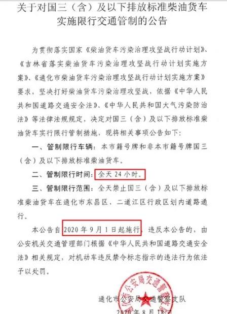 管制限行范圍:全天禁止國三(含)及以下排放標準柴油貨車在通化市東昌區(qū)、二道江區(qū)行政區(qū)劃內(nèi)道路通行。