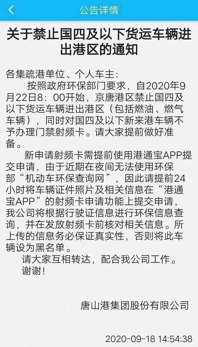 河北唐山港發(fā)布通知,9月22日上午八點(diǎn)開始,京唐港區(qū)將禁止國(guó)四及以下貨運(yùn)車輛進(jìn)出港區(qū),包括燃油、燃?xì)廛囕v,同時(shí)不再給國(guó)四及以下新來(lái)港車輛辦理門禁射頻卡。