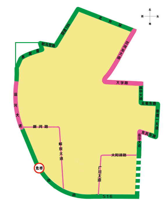 ? 駙馬營(yíng)路—G105—北外環(huán)—岔河?xùn)|大道—大學(xué)東路—晶華大道(北段)—天衢東路—崇德一大道—東風(fēng)東路—晶華大道(南段)—S516—運(yùn)河大道—魯冀界以內(nèi)。